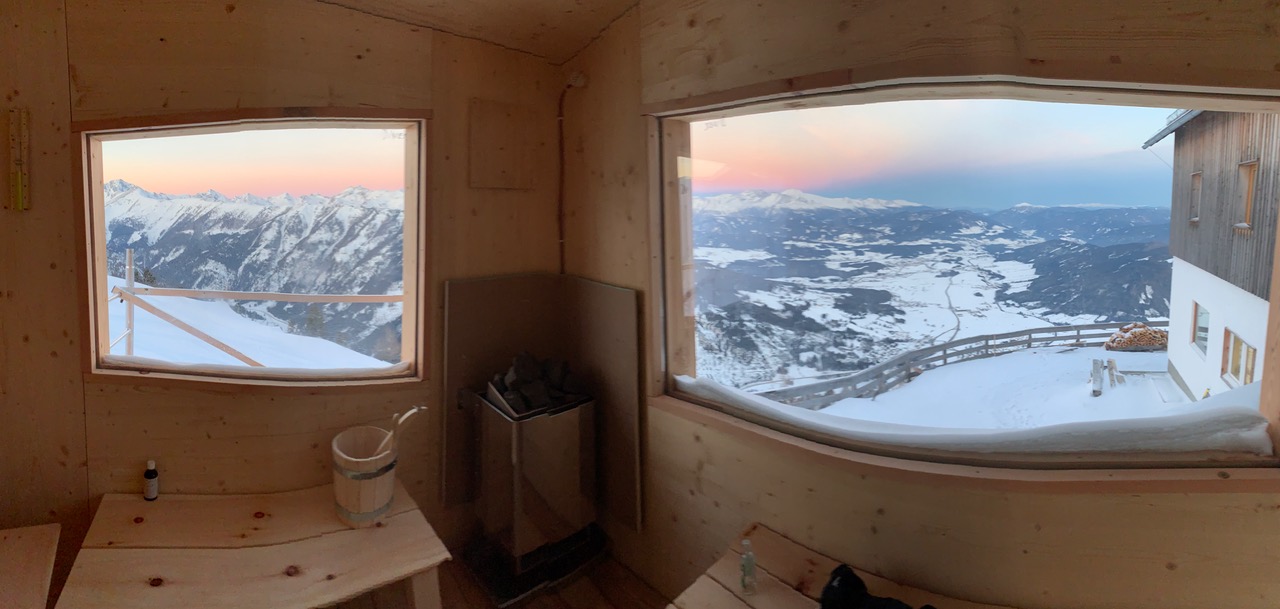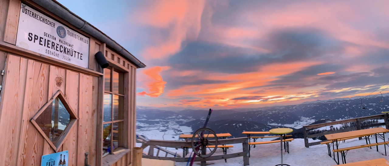 Gelegen an einem der schönsten 3-Länder-Panoramapunkte der Welt (& direkt an der Skipiste Grosseck-Speiereck ) bietet die Speiereckhütte feine Kost und Logie auf 2066m, tägliche Saunaaufgüsse um 17 und 18h, gute Musik, sowie super WLAN.