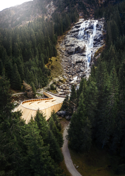 Unmittelbar am Fuße des Wasserfalls lädt das Grawa Observatorium, das als barrierefreie Plattform errichtet worden ist, mit seinen Sitz- und Liegemöglichkeiten regelrecht dazu ein, länger zu verweilen und sich der gesundheitlich wohltuenden Gischt des Wassers hinzugeben.