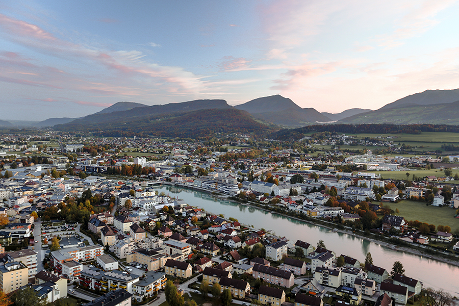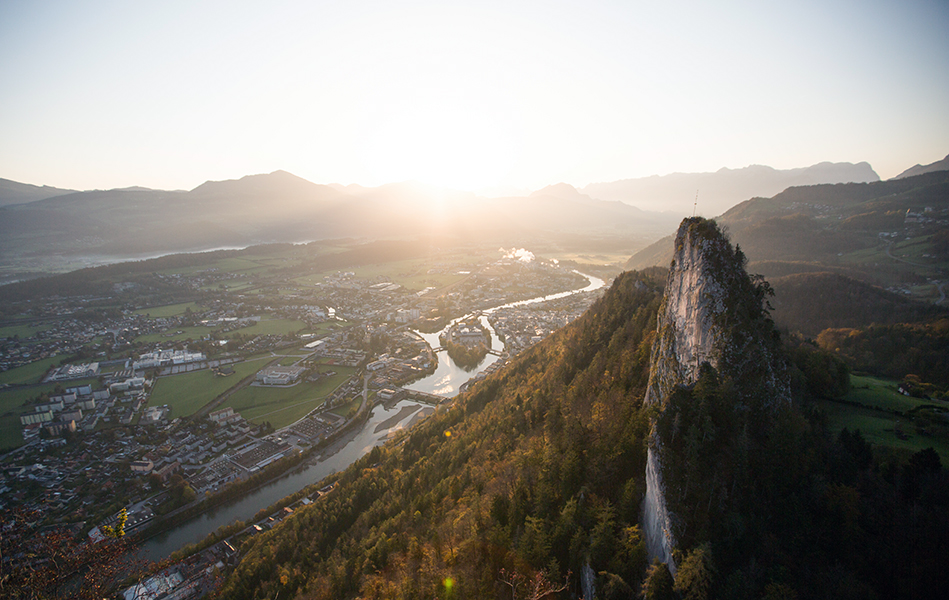 Und über allem wacht der Dürrnberg, der Hausberg der Halleiner. 400 Meter oberhalb der Stadt gelegen, locken seine Hänge im Sommer wie im Winter zahlreiche Ausflügler an, die hoch oben über der Stadt einen grandiosen Ausblick genießen: das Tennengebirge im Süden, die Berchtesgadener Alpen im Westen, die Osterhorngruppe im Osten und gegen Norden schlängelt sich die Salzach durch das nach ihr benannte Tal.