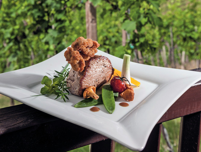 Wir verwöhnen Sie mit hausgemachten und regionalen Produkten, sowie Wildspezialitäten aus dem eigenem Gehege, nicht zu vergessen die vorzüglichen Weine aus dem eigenen Weingut.